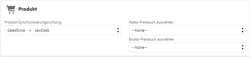 Diese Einstellungen ermöglichen es euch, eines der im System vorhandenen Preisbücher als Brutto- bzw. Netto-Preisbuch auszuwählen. Wenn die Synchronisierungsrichtung auf Salesforce ← sevDesk eingestellt ist, wird das ausgewählte Preisbuch mit Preisen aus sevDesk gefüllt. Im Falle der Synchronisierungsrichtung Salesforce → sevDesk werden die Preise aus dem ausgewählten Preisbuch übernommen, wenn die Produkte an sevDesk gesendet werden.