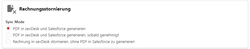 Wenn dieser Synchronisationsmodus ausgewählt ist, wird das PDF-Dokument für die Rechnungsstornierung sowohl in Salesforce als auch in sevDesk erst nach Annahme der Stornierung der Rechnung erzeugt.