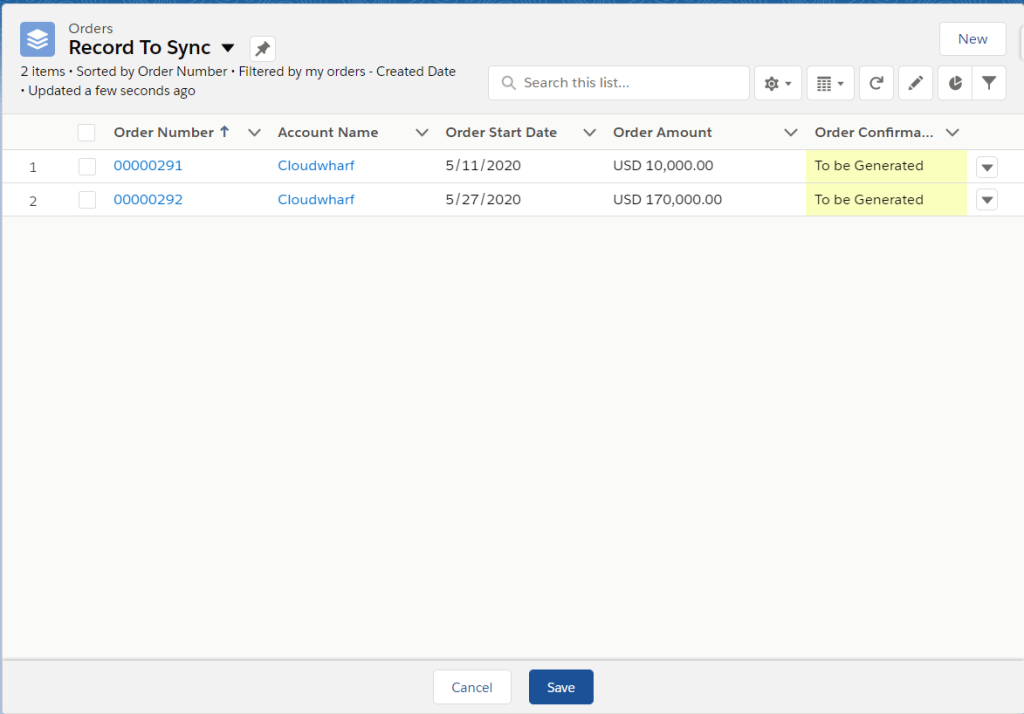 Order.cwharf_sevdesk__Sync_Status__c steuert den Synchronisationsprozess von Rechnungen und Lieferscheinen abhängig vom Feld cwharf_sevdesk__Type__c.