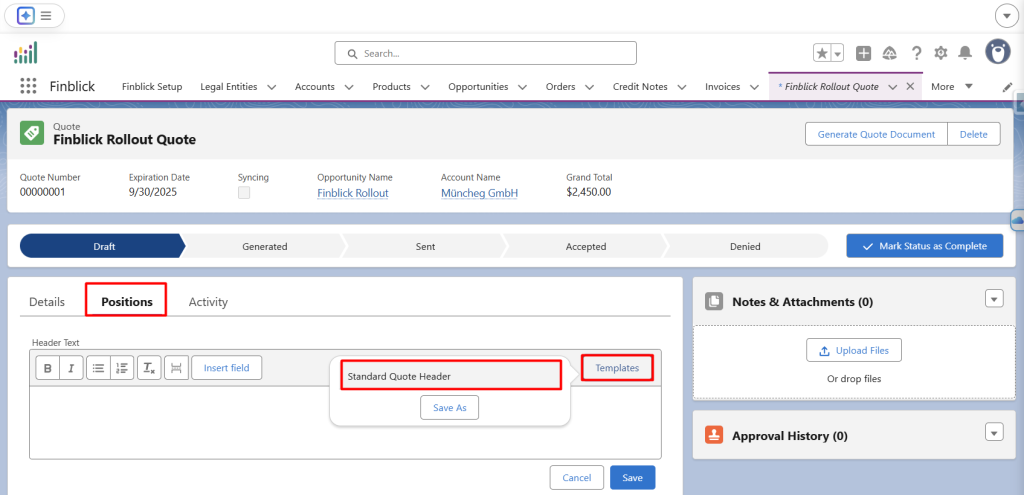 • Die Textvorlage steht danach in den Feldern Kopfzeile und Fußzeile im entsprechenden Objekt (z. B. Angebot) zur Auswahl bereit.