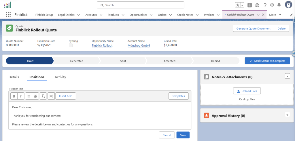 1. Zum Tab Positionen im Angebotsdatensatz wechseln:
