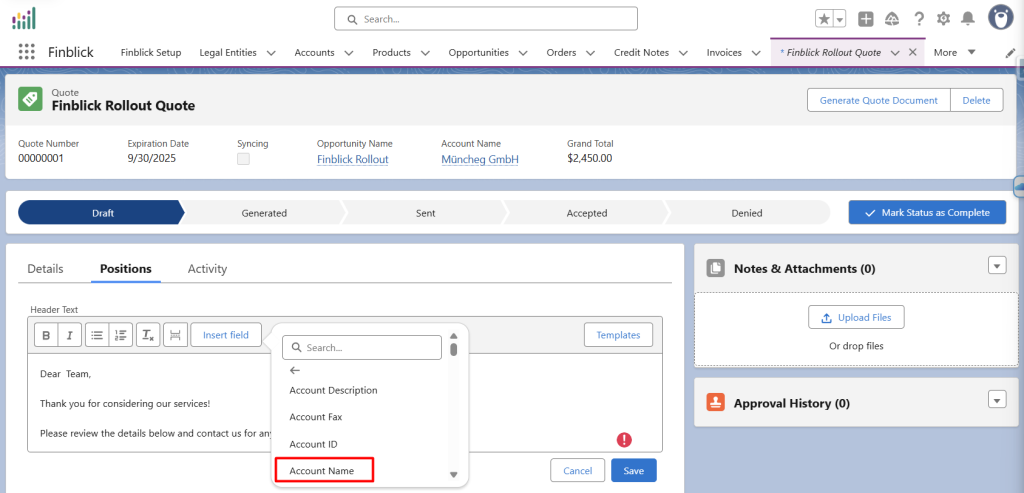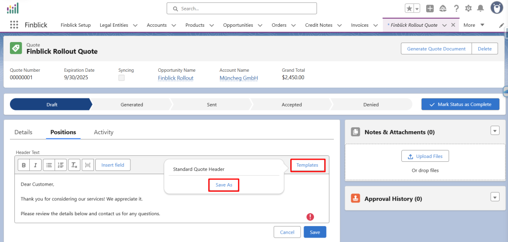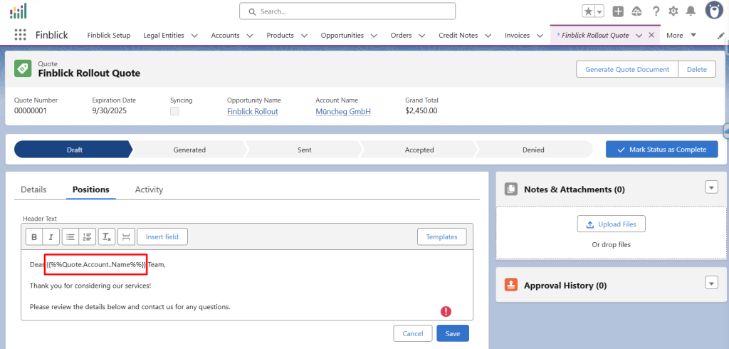 • Objekt – definiert den Dokumenttyp, in dem die Vorlage verwendet werden kann (Angebot, Auftrag, Rechnung (finblick__InvoiceLine__c), Gutschrift (finblick__CreditNoteLine__c)).