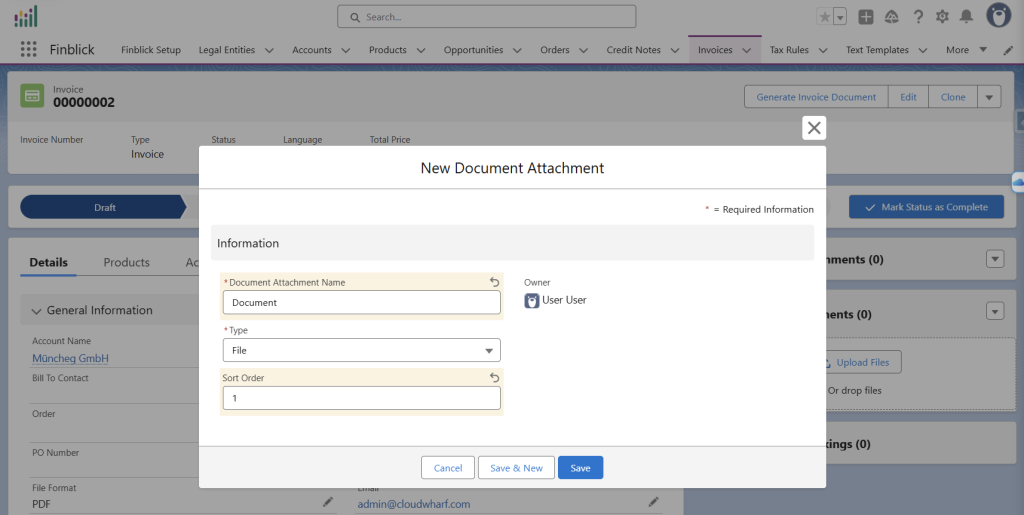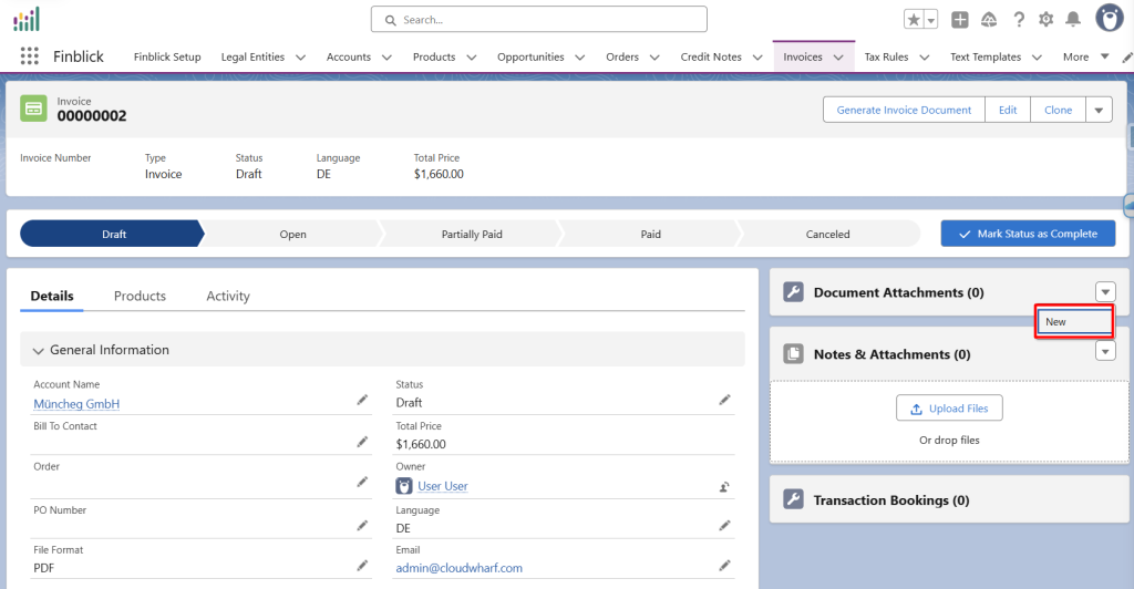 - Use the related list on the document to create a new Document Attachment record by clicking New.