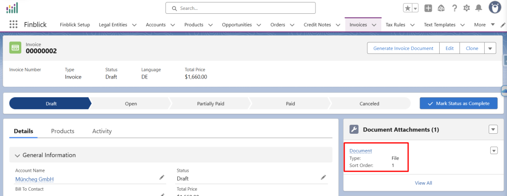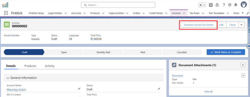 Another important note: Make sure the Finblick Invoice object is used — finblick__Invoice__c — not the standard Salesforce Invoice object. If the tab label appears italic even though the Finblick App is opened, that tab is for an object outside the app and is therefore not the correct Invoice object.