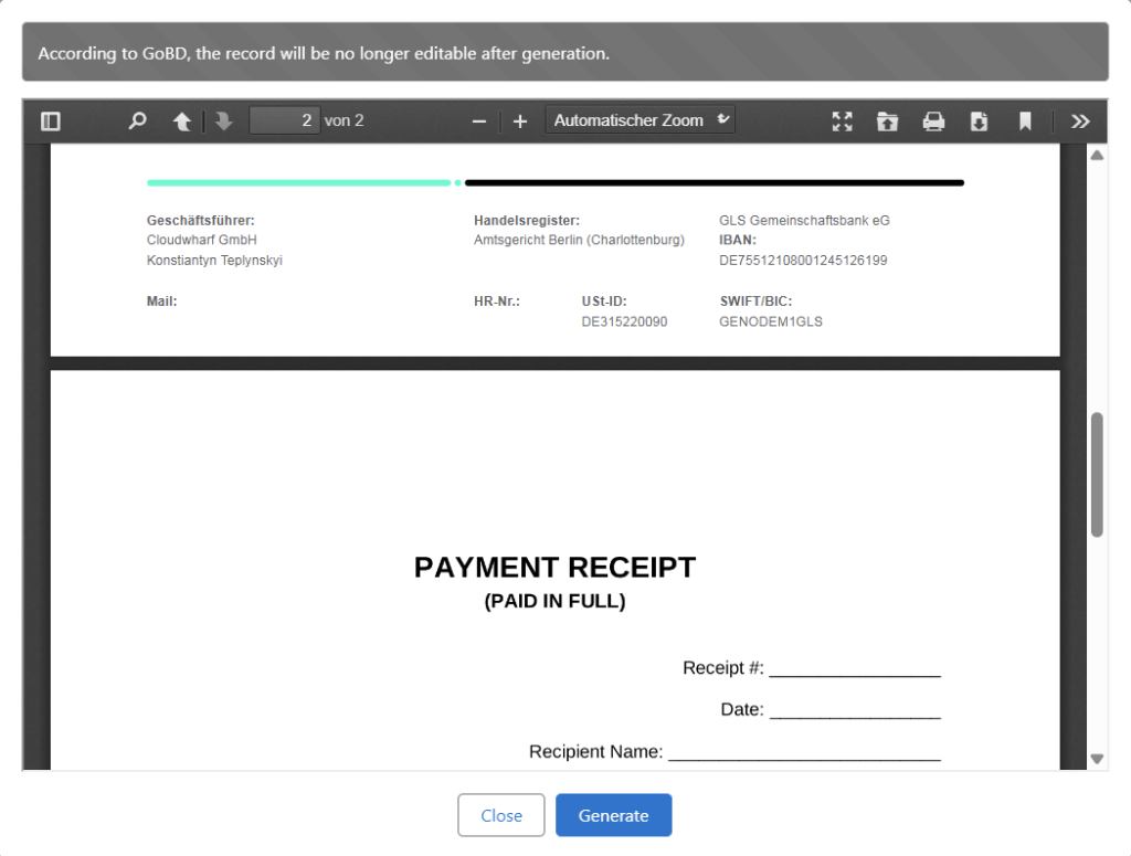 With these steps, both files and document templates as attachments could be added to the financial documents and control the order in which they appear in the generated PDF.