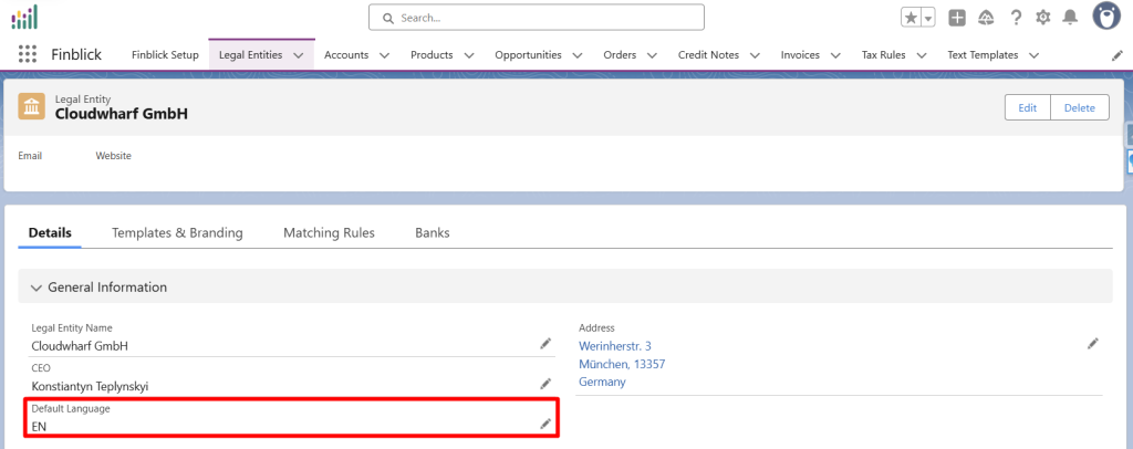- The default language for all documents (Quote, Order, Invoice, Credit Note) is defined in the Legal Entity record.