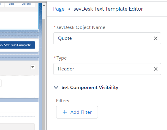 sevDesk Text Template Editor component has several settings where you should specify the corresponding Object Name and the Field Type: