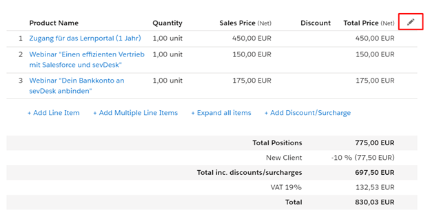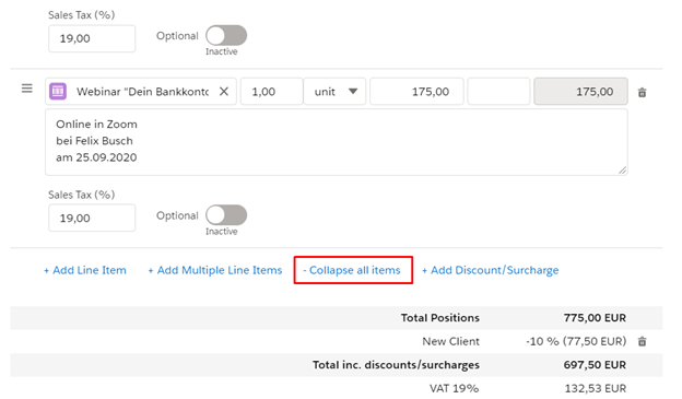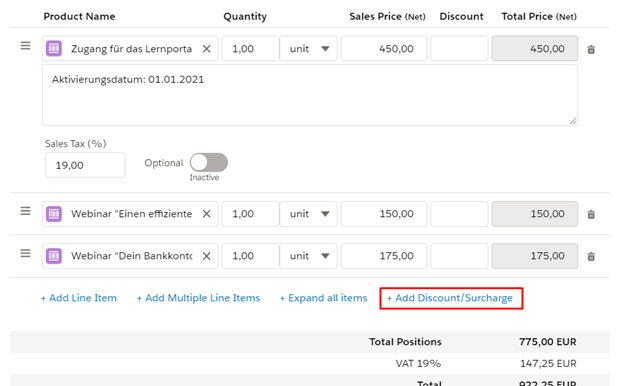 - Sales Tax (%) – the predefined value comes from the corresponding Price Book Entry of the product. Field is Sales Tax (cwharf_sevdesk__Sales_Tax__c)