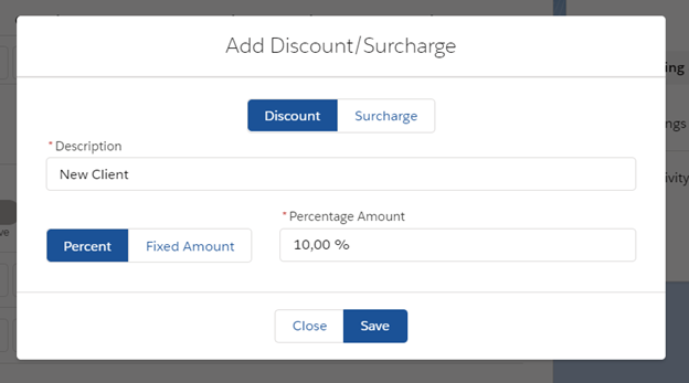 Clicking the function invokes the modal window where you can add the appropriate discount/surcharge: