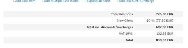 The component allows you to add the global discounts/surcharges. The corresponding function is “Add Discount/Surcharge“: