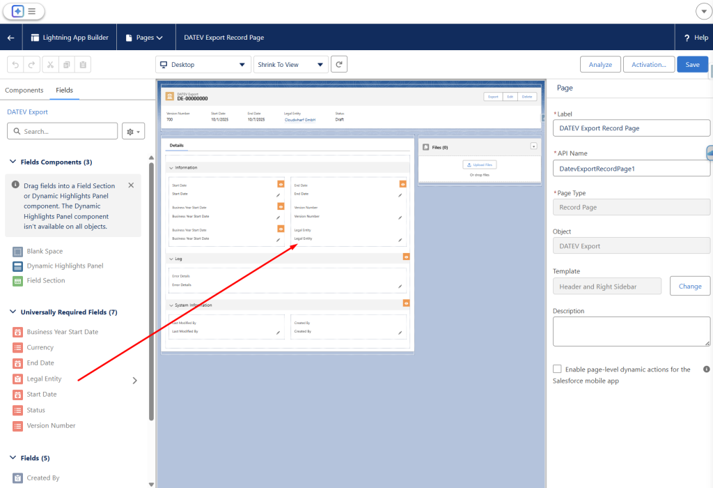 Example: Adding the Legal Entity field to the DATEV Export record page