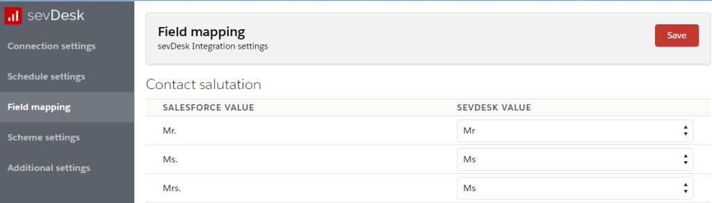 Select Field mapping in sevDesk setup. On this page you can set picklist field relations. These have to be configured as those values are dynamic and are individual in every org.
