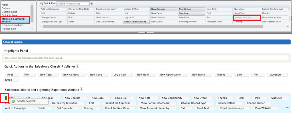 - Find “Send to sevDesk” button and move it to layout with using drag and drop